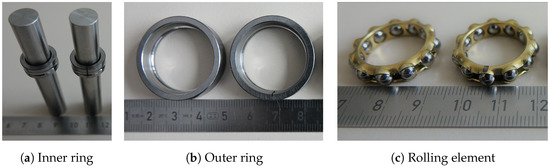 The simulated bearing failures include damaged outer rings, damaged inner rings and damaged rolling elements. All the aforementioned failures are tested in two severities; this means that one small slot and one larger slot are inserted into the inner ring and the outer ring. Instead of a slot, the defect at the rolling element is a flat spot. The damaged parts as well as their counterparts without damage are depicted in Figure 2. The bearings are precision magneto ball bearings of type E12 (DIN 615) (12 × 32 × 7 mm), which are essentially deep groove ball bearings with an outer ring with only one shoulder, providing a separable outer ring from the cage and inner ring. The cage allows removal from the inner ring and individual bearing balls within the cage can be swapped. Thus, with this type of bearing it is possible to selectively mount individual defects or defect combinations. Damages of different sizes are introduced to the inner rings, the outer rings and the rolling elements by wire electrical discharge machining (EDM). The defect sizes were chosen in relation to the diameter of the rolling elements of 4.7 mm. For the cases of inner and outer rings, slots with widths of 8% and 40% in relation to the ball diameter were inserted (corresponding to 376 and 1880 m each). A flattening was introduced to the rolling elements with depths of 2% and 8% of the rolling element diameter (corresponding to 94 and 376 m each). The precision of the wire EDM amounts to ±10 m. The relative dimensions of the bearing damages are are thus in a similar range to those reported in [31], where damages in the range between 9.6% and 28.8% of the rolling element diameter were used.