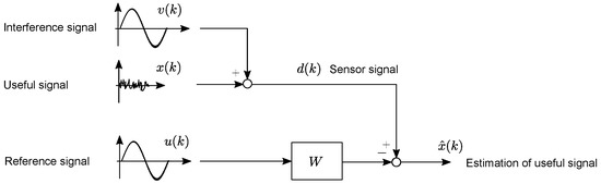Further, the signal contains interference from power mains, i.e., it is deteriorated by harmonics of the mains frequency of 50 Hz. Thus, an interference canceling has to be implemented (see Figure 3). The sensor signal is composed of a useful signal and the interference . A reference signal of the same frequency as the interference is generated. By applying an appropriate filter W with an impulse response , a signal can be obtained that cancels the interference in the sensor signal. The remaining signal thus provides a good estimation of the useful signal: