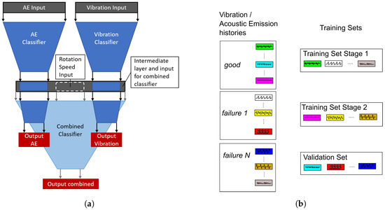 In order to improve the training of the combined classifier, a stage 1 dataset and a stage 2 dataset were defined from the development dataset. An illustration of the splitting of the whole set of measurements into the stage 1 and 2 datasets as well as the validation dataset is depicted in Figure 4b. Like the validation dataset, the stage 2 dataset comprises one measurement per defect type and size. In an optimal configuration, the stage 2 dataset is only used to train the combined classifier, while the AE classifier and the vibration classifier are trained with the stage 1 dataset.