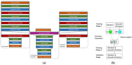 All the subclassifiers mentioned in Section 2.3 are multi-layer perceptrons. This type of neural network together with the frequency transformed input samples was chosen, since for vibration measurements it was shown that it can lead to classifiers with better generalization ability compared to, e.g., convolutional neural networks, which receive the time domain signals as an input [1]. The AE classifier has three hidden fully connected (dense) layers, each with 1024 nodes, and the vibration classifier has two hidden layers, also consisting 1024 nodes, respectively. Dropout was applied to all hidden layers of both classifiers to reduce overfitting. The combined classifier uses the activations of the last hidden layer of both the AE classifier and the vibration classifier as well as the scaled rotation speed as one concatenated input vector. In addition, it has two hidden layers, each with 128 nodes. No dropout was applied to the combined classifier since enough variability was induced by the intermediate layer values of the AE and vibration classifiers. The neural network was implemented using Tensorflow [42] and the used source code is documented at the corresponding Github repository [39]. Its layer architecture is depicted in Figure 5a.