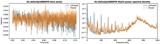 For the classification, vibration signals from the sensor mounted close to the bearing were used. The acquired vibration data contain a significant DC offset, since the accelerometers were powered over the signal line. A Bessel high pass filter of order 4 and a cut-off frequency were applied to the vibration signal. With a roll-off of 80 dB per decade, it allowed for a sharp separation of the information contained in the vibration from the offset. By applying the filter to time series twice, forwards and backwards, the effective order of the filtering operation doubled, while the phase lag was compensated. Details on the design of digital filters can be found in [40]. The algorithms are well established and part of standard libraries such as Scipy [41], which was used here.