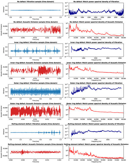 Examples from the measurement data. Left column: samples from all four used defect states in time domain alternating between vibration and acoustic emission. Right column: power spectral density calculated by Welch’s method of the samples in the left column.
