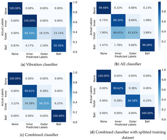 At first and as a baseline, both the AE and the vibration classifiers were trained on the full training dataset (including stage 1 and stage 2 training datasets). Each one acquired the scaled feature vectors from the respective sensor. Both classifiers achieved accuracies close to 100% on the training dataset. Classification results of the trained classifiers on the unseen validation dataset are visualized in Figure 8a,b. While both classifiers correctly or almost correctly classified the defect free measurement and the measurement with the damaged rolling element, they both failed to classify the measurement of the outer ring defect. The inner ring defect can be recognized by the AE classifier, while the vibration classifier is only partially able to correctly classify this measurement.