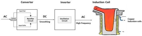 The electric furnace was developed during the 19th century. Such furnaces are divided into electric arc furnaces, which generate electricity directly through the metal, and induction furnaces, which generate heat indirectly by inducing electricity. An electric furnace is cylindrical in shape for energy efficiency and there is no need to maintain a stable condition, unlike with a blasting furnace. Electric furnaces are adequate for small-volume production, special types of steel, and alloy production, rather than large-scale metal production use for pig iron. An electric arc furnace melts the metal using the energy generated by an arc between electrodes. By contrast, an induction furnace produces heat by inducing a high-frequency current. The configurations of the electrical parts of the system are the converter, inverter, and induction coil (furnace). The external current flows in the form of an alternating current. The alternative current is then converted from the rectifier circuit in the converter, to a smoothed direct current. Subsequently, the inverter re-converts a direct current into an alternating current with a high frequency. Finally, a high-frequency current is fed into the induction coil. The whole electricity flow process is shown in Figure 1.