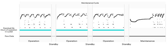 Owing to the absence of specific maintenance records (date, time, duration) in the raw data, we analyzed the frequency pattern and operation event logs to extract such information. In the frequency data from raw data, we were able to distinguish maintenance and patterns, which are shown in Figure 3. We calculated the residual life in a particular operation until the latest maintenance. The calculated residual life times were then used as a label in the training data for neural network models.