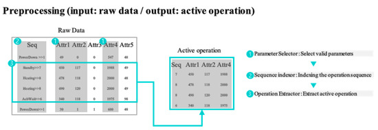 Preprocessing is the process of removing noise from raw data and separating the operation. Induction furnaces generate noise while receiving electricity and noise generated during an operation. The noise removal and extraction of operational data are mandatory. Figure 5 illustrated the procedure of the preprocessing. The preprocessing contains the following procedures: (1) parameter selection, (2) sequence indexing, and (3) operation extraction. The detailed explanations are as follows: