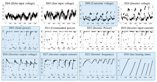 The raw data included invalid or similar parameters. Excluding the time and sequence, the following figure shows four sensor attributes: (1) voltage (D04, D05, D08, and D24), (2) power or current (D03, D12, D22, and D25), (3) output (D26 and D27), and (4) other attributes (D23, frequency; and D30, heating time). Each category (except frequency and heating time) showed a high correlation in their group. Considering the correlation in the category, we removed duplicate parameters in each group and selected valid parameters. The selected parameters are as follows: D03, D08, D23, D26, D27, and D30, as displayed in Figure 6.