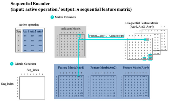 In the Figure 7, the sequential encoder consists of three parts. First is active operation for input data. Second is matrix generator. And third is matrix calculator. The conversion procedure is as follows: First, the matrix generator defines the matrix size. The number of operational events defines the size of the matrix. Second, the matrix calculator calculates the adjacent and feature matrices and derives the sequential feature matrix. In the operational data, the sequence is converted into an adjacent matrix, and the other attributes are converted into feature matrices based on the adjacent matrix. The sequential feature matrices obtained through this process reflect both the length and attribute values of each operation and attribute. Third, the adjacent matrix and feature matrix are divided. The pseudo-code for the matrix conversion is as follows: