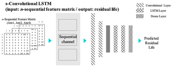 - Prediction model (s-convLSTM): Sequential feature matrices are distributed and input over n-channels. The prediction model consists of a convolutional layer and an LSTM layer [27]. After the prediction is complete, the model exports the residual life of the induction furnace. In the field application, the manager is able to plan the optimal maintenance schedule by using this prognosis results. These actions keep the system healthy. As an application in the field, the manager can easily plan the optimal maintenance schedule by using the prognosis results. These processes can help the manager keep track of the system’s health. A further explanation of the methodology is as follows.