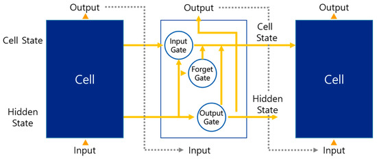 LSTM is a type of recurrent neural network (RNN) [28]. Introduced by Hopfield [29], an RNN is a neural network architecture that primarily deals with sequential data, including time-series data. The distinctive feature of an RNN from feedforward neural networks is the loop in the layer. This makes the RNN memorize previous data while training. Continuous multiplication in an RNN causes gradient vanishing problems [30]. To solve this problem, an LSTM was developed. The LSTM layer generates feedback through a sum operation, and solves the gradient vanishing problem [30]. The general structure of the LSTM is shown in Figure 9.