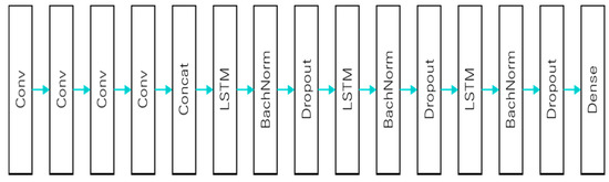 In this study, time-series predictions were conducted using a 2D matrix. Two methods of the convolutional LSTM approach were considered. One was developed by Donahue et al. [27], and is the so-called long-term recurrent convolution (LRCN). For the second, Xingjian et al. [34] inserted a convolution operation in the LSTM gate operation. If we adapt the Xingjian approach to our data, the model output is then not interpreted for labeling because of the inconsistency of the data. In our study, we used the LRCN approach. Similar to the LRCN approach, a CNN layer was inserted in front of the LSTM layer to process 2D data with multiple channels, and the feature map was input into the LSTM layer. Batch normalization was applied and dropout layers were inserted between LSTM layers. Adam was used as the optimizer. The configuration of the prediction model is described in the Figure 10: