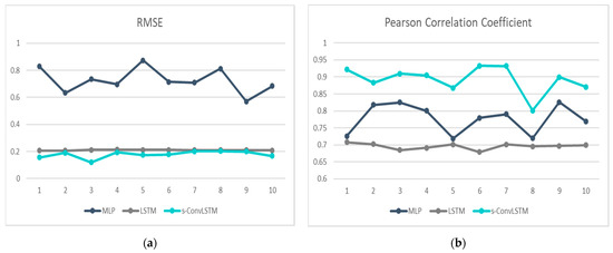 PCC represents the tendency between the actual and predicted values. The higher the PCC value, the better the performance of the neural network. The proposed methodology performed best, on average, followed by MLP and LSTM. In summary, although the proposed methodology showed the best performance, on average, for both RMSE and PCC, but the LSTM on the standard deviation showed marginal or better results. The following is a graph of the result table. In the Figure 11, s-convLSTM shows best performance for both metrics.