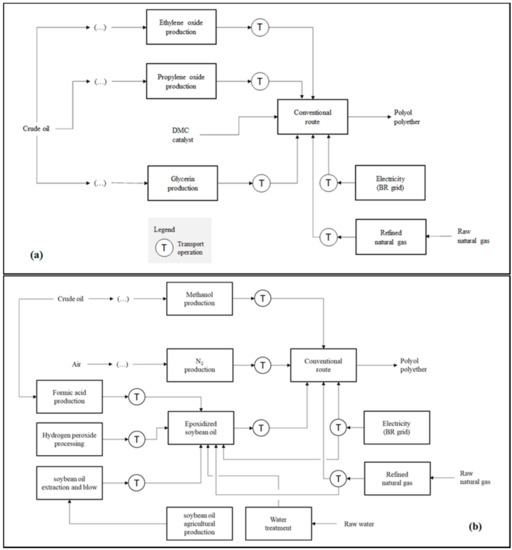 The procedure was applied to raw materials (epoxidized soybean oil, nitrogen and methanol) and utilities. The original data are also part of the Ecoinvent database, in the form of the following datasets: “Formic acid {RoW}| production, methyl formate route | APOS, U,” “Methanol {GLO}| production | APOS, U,” “Hydrogen peroxide, without water, in 50% solution state {RoW}| hydrogen peroxide production, product in 50% solution state | APOS, U,” “Nitrogen, liquid {RoW}| air separation, cryogenic | APOS, U” [51] as well as “Soybean oil, refined {RoW}| soybean oil refinery operation | APOS, U,” and “Soybean oil, crude {BR}| soybean meal and crude oil production | APOS, U” [52].