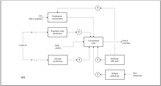 The synthesis of poly(propylene/ethylene oxide) glycol (PPG) copolymers was selected for this analysis due to their wide use in rigid foam and high-performance paint manufacturing [23]. The investigation was carried out in two stages. In the first, the environmental performance of the conventional PPG route and its two variants was calculated by an LCA and compared to each other. The conventional route involves cyclic ether mixtures, in which complex double-metal cyanides (DMCs), which are inorganic solids containing two or more metal ions linked by cyanides used for the industrial epoxide polymerization, replace potassium hydroxide as catalysis agents. In one of the alternative processes, epoxides were replaced by a chemically modified vegetable oil in order to introduce hydroxyl groups for polyol generation. In the other arrangement, CO2 captured from CCU practices was used to partially replace epoxides in a reaction with propylene oxide and glycerin for PPG synthesis. The impacts of each route were estimated in terms of primary energy demand, global warming potential, acidification, photochemical oxidants, and freshwater ecotoxicity, and the analysis allowed for the identification of adverse effects in each situation. In the second stage of the study, actions aimed towards the mitigation of environmental bottlenecks were proposed and specified, and a second LCA round evaluated their effectiveness. All processes were modeled for typical Brazilian operating conditions.