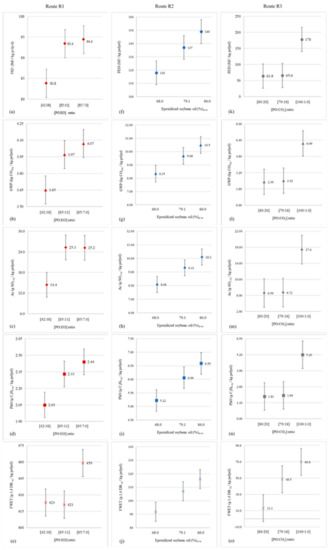 Behavior of the environmental performances of routes R1 (a–e), R2 (f–j), and R3 (k–o) due to the oscillation of parameters of significant influence on their impact profiles.