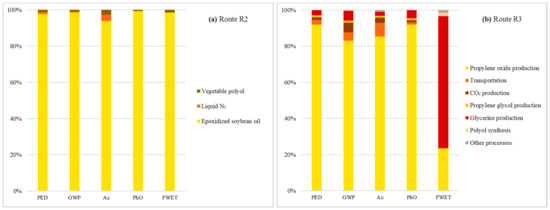 The search for impact foci in R2 and R3 only corroborated the convergence and grouping contribution trends throughout a certain stage of each processing detected during the individual performance analyses for each impact category. For R2, the accumulation converges to the synthesis of epoxidized soybean oil, whose accumulated share in the arrangement’s impact profile ranges between 94%, for Ac, and 99%, for PhO (Figure 3a). In the case of R3, centralization occurs in propylene oxide processing, which accounts for the most PED (92%), GWP (83%), Ac (85%), and PhO (92%) contributions (Figure 3b). The exception is FWET, whose glycerin production accounts for 73% of the impacts for this category, maintaining PO synthesis in the background, with only a 23% share.