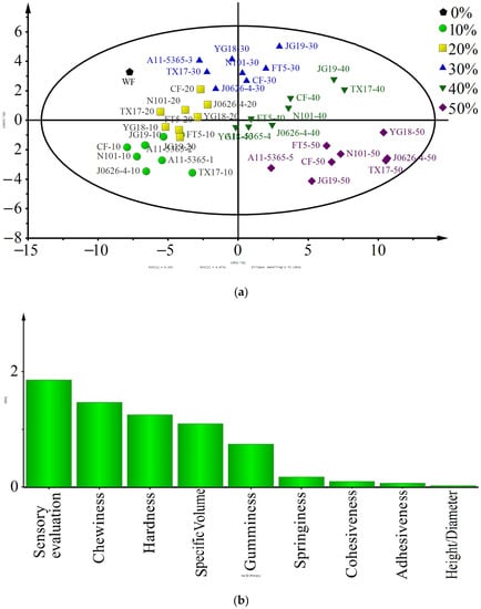 The VIP value was detected to further determine which variables significantly contribute to the OPLS-DA prediction model. Sensory evaluation, chewiness, specific volume, and hardness (VIP > 1) were considered to be contribution indicators of CSB (Figure 1b). The loading-plot diagram in Figure 1c demonstrates that the addition level indicators gathered near the origin, whereas some evaluation indicators that had a considerable contribution to the prediction of the model classification were scattered at the two ends of the plot. The loading-plot diagram supports the determination of the VIP value.