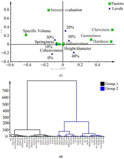 The clustering results of different cultivars and different additive amounts, as shown in Figure 1d, indicate that they could be divided into two groups: CSB with mostly 10–30% cultivars and that with mostly addition levels of 40–50%. This indicates that the addition level is the key to the production of CSB. With an increase in the total amount of WFMF, all cultivars can cause the volume to decrease. The molecular structure of amylopectin destroyed the network structure during the manufacturing process for CSB [] due to the higher content of amylopectin in the glutinous cultivars. Compared with the japonica cultivar, glutinous CSB exhibited increasing hardness and chewiness and a large reduction in volume []. When the amount of WFMF added was 20–30%, CSB had improved evaluation and texture properties. When the addition of all millet cultivars exceeded 40%, the CSB’s specific volume and texture were considerably degraded.