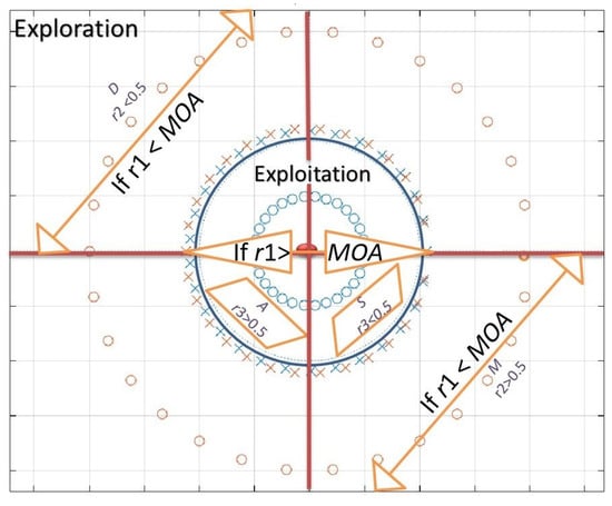 The exploration operators of AOA are modeled in Equation (2). The exploration phase uses the D or M operators conditioned by MOA. The D operator is prepared by 0.5, or, otherwise, by the M operator. is a random number. The position updating process is determined as follows.
