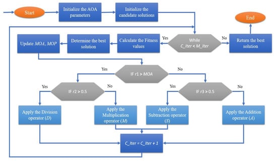 In this section, we describe the exploration and exploitation phases of the original AOA [29], which is motivated by the main operators in math science (i.e., multiplication (M), division (D), subtraction (S), and addition (A)). The main search methods of the AOA are presented in Figure 1, which are illustrated in the following subsections.