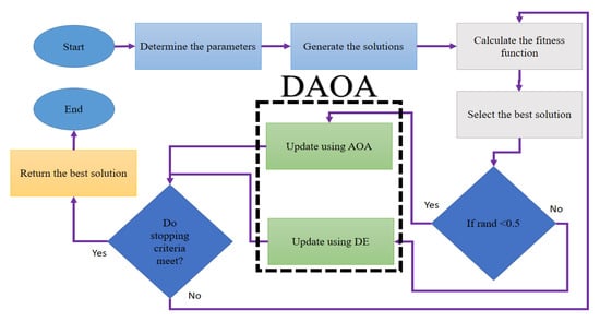 Figure 3 depicts the proposed DAOA approach in this section. The DAOA procedure begins with (1) determining the values of the used algorithms’ parameters, (2) generating candidate solutions, (3) calculating fitness functions, (4) selecting the best solution, (5) if a given condition is true, the AOA is executed to update the solutions; otherwise, the DE is executed to update the solutions, and (6) then another condition is given to stop or continue the optimization process. Figure 3 shows the flowchart for the proposed DAOA. The pseudo-code of the DAOA algorithm is given in Algorithm 1.