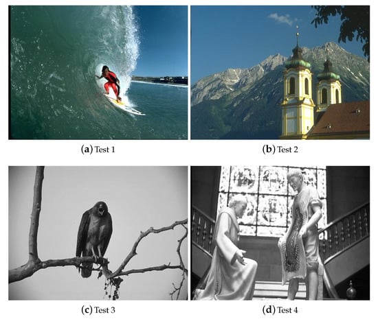 In this section, the benchmark image data sets are presented in Figure 4 and Figure 5. Two image types were used in this paper’s experiments, taken from nature (as seen in Figure 4) and medical CT images (as seen in Figure 5). We chose eight images: two-color images from nature (i.e., Test 1 and Test 2), two gray images from nature (i.e., Test 3 and Test 4), two COVID-19 CT images (i.e., Test 5 and Test 6), and two normal COVID-19 CT images (i.e., Test 7 and Test 8). These benchmarks were taken from the Berkeley Segmentation Data Set: Images and BIMCV-COVID19 [52].