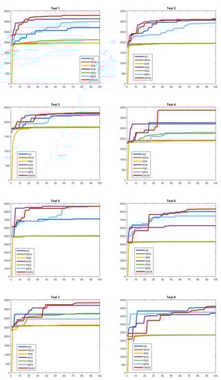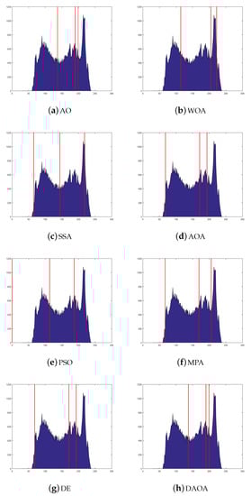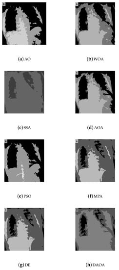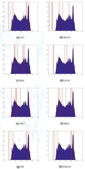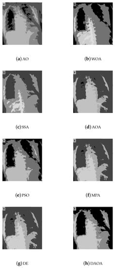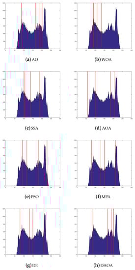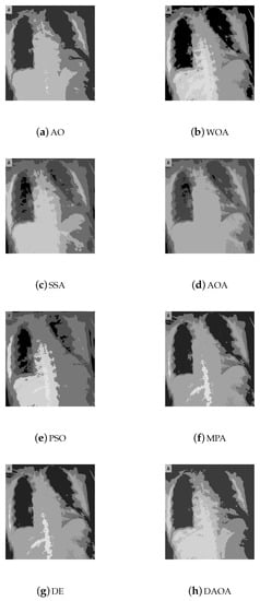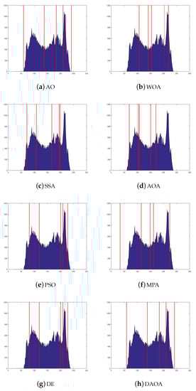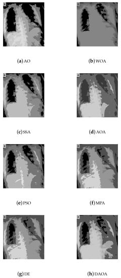 Figure 16 shows the convergence curves of the proposed DAOA and its comparative optimization algorithms on eight tested images (i.e., Test 1 to Test 8); it can be seen that the proposed DAOA performs better than all involved other optimization methods in Test 8 when the threshold value is 6. For almost all the test images, the excellent optimized performance with accelerated convergence and more reliable accuracy achieved by the proposed DAOA can be seen as being remarkably smoothing behavior in the convergence curve. Moreover, we recognize that the curves of the proposed method always converge smoothly, reflecting the proposed DAOA’s ability to avoid the common problem (local optima). In the end, the proposed DAOA reached the best solutions almost in all the tested cases, compared to the other comparative methods, as clearly shown in Figure 16.