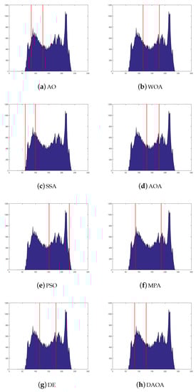In this proposed DAOA, Kapur’s entropy is utilized for achieving optimum threshold values. Measurement of the bi-level thresholds needs the optimization process’s objective function, as shown in Equation (11).