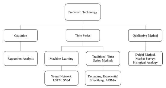 The demand forecasting problem has been studied for many years, and there are numerous forecasting methods and techniques developed as qualitative forecasting methods, time series analysis, and causal methods, as shown in Figure 1 [11]. For example, time series is stated as the use of historical data to analyze future values, and the basic concept of the causal method is to obtain causal relationships from experimental studies of causal relationships and theoretical roles in the discourse, incorporating variables or factors that can affect the forecast into the forecasting model. However, the tray demand is intermittent (or irregular), and the traditional approach’s model performance is not very good. Such a demand is characterized by the absence of time-interval demand and a significant variation in the level of demand for the period in which actual demand occurs [12], and intermittent demand is stochastic with a large proportion of zero values, implying a large variability between non-zero values [13].