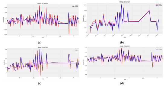Overall, the sum of a single week is set in the time axis filter. In the process of data conversion, there will be no customer order for a product for a single week, and the value of 0 will be automatically converted during the reading process. The null value is handled by the following four methods of the root mean square error (RMSE) model evaluation, as shown in Figure 4, (a) retaining the original data with an RMSE of 10,176.29; (b) deleting the RMSE of 2072.768; (c) taking the sample on the complementary value of The RMSE of (a) retained original data are 10,176.29; (b) deleted RMSE is 2072.768; (c) up-sampled RMSE is 5222.129; and (d) average RMSE is 7096.927, so the lower RMSE value of the deleted null is chosen to present the historical single-week sales volume data in this study, as shown in Figure 4.