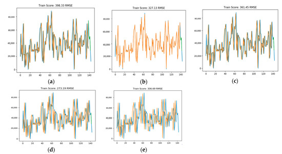 Figure 6 shows the product rolling prediction schematic diagram: the original data are divided into 95% training and 5% test; blue represents the original data, orange is the training data, and green is the test data. Figure 6a shows the results of the 5 predictions using the test set. Figure 6b shows the training length will be fixed; that is, each prediction of datum out, the training set will be deleted from the initial value, and the previous predicted value-added for the training set, predicting the second to fifth data, and so on. Figure 6c is, according to Figure 6b above, the second actual demand quantity to the training set and predict the third to fifth strokes of the test set. Figure 6d adds the third actual demand to the training set and a forecast of the fourth to fifth demand in the test set. Figure 6e adds the fourth actual demand to the training set and a forecast of the fifth demand in the test set.