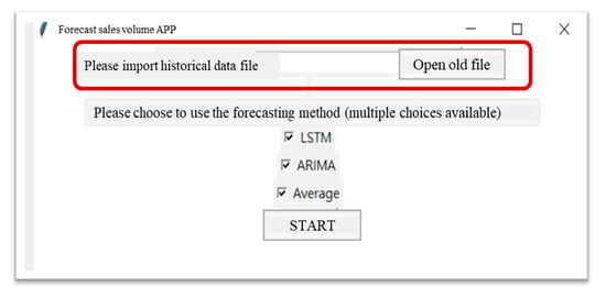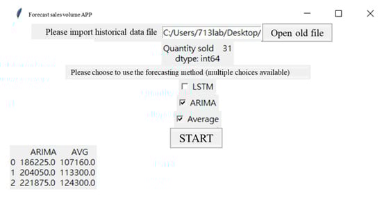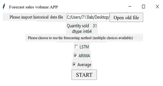 Validated by actual data and prediction results, it is confirmed that the prediction model proposed in this study has a better prediction model. This study provides a tkinter package that creates a GUI library in python that can be intuitively embedded into an enterprise system. Whenever the data are updated, it is only necessary to put in the files of sales time and sales quantity of various products to predict the sales quantity in different ways, and for the next three weeks, in about 10 s. This research uses Plato’s 80/20 rule is to obtain the company’s top five products to make predictions. However, the few key products vary over time. Therefore, it is necessary to import a new Excel file to update the data to make the prediction results more referenced. The company’s empirical rule (MA = 5), the exponential smoothing method in the traditional time-series method, and the ARIMA and LSTM prediction model used in this research in forecasting the sales volume are averaged with the above four methods. Automatic forecasting model: the maximum number of forecast periods in the system is 3 in this study, to improve forecasting accuracy. The weekly or monthly forecasted sales quantity for a specific product can facilitate the case company with future orders and the reference basis for inventory management. The following are the process steps of the forecast demand system: