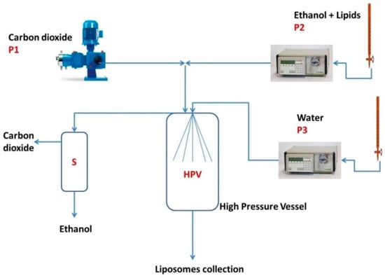 For all these reasons, CO2-assisted high-pressure methods have been proposed to solve almost all these problems [,], since carbon dioxide can be employed as a non-toxic co-solvent during drug carrier formation. Among the proposed techniques, SuperLip is a CO2-assisted process which inverts the traditional steps of hydration of a lipidic layer, by first creating the droplet of water and, then, a double lipidic layer around it []. This is guaranteed by a pressurized environment, where CO2 is mixed with ethanol, forming an expanded liquid, as a support for lipid deposition around water droplets. This process is already employed in some pharmaceutical, cosmetic, textile, and nutraceutical applications [,], obtaining encapsulation efficiencies of hydrophilic, amphiphilic, and lipophilic compounds, up to 99% at nanometric level, with a low solvent residue and high cellular uptake. Additionally, the high time stability of liposomes produced in this manner has already been demonstrated using this process [], as well as their capability to deliver entrapped molecules directly to the target cells [].
