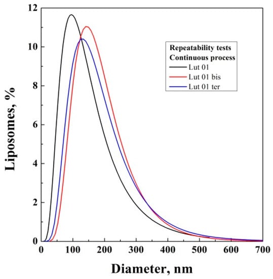 However, as it is possible to see from the results, the idea of this work was not only the encapsulation of lutein into liposomes, but also to try to tune drug release of lutein by varying the production operating parameters [,]. Among all the parameters studied in this paper, it was particularly interesting the effect of operating temperature on the successive drug release performed after the production. There is a substantial difference among the production of temperature-sensitive liposomes and the liposomes whose drug release is tuned by operating temperature. In the first case, liposomes are made of specific and expensive phospholipids, and are prepared in such a manner that they can open their structure and release their content only when a sudden external increase of temperature is applied. Instead, in this work, a different phenomenon was studied: the possibility to create a double lipidic layer with different resistance to mass transfer of lutein among the internal regions and the external bulk. In this case, the drug release was faster or slower, depending on the temperature of the process during production, and without the addition of external stimuli during the subsequent drug release.