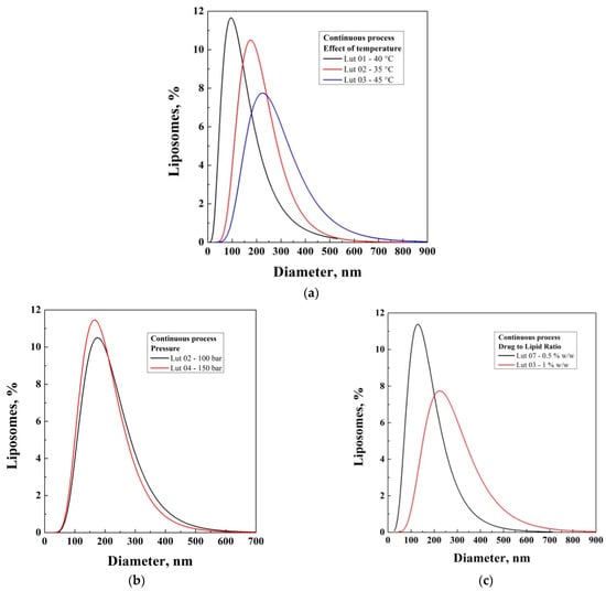 Influence of temperature on liposome mean dimensions for a pressure of 100 bar and a drug to lipid ratio of 1% mass (a); influence of operating pressure on liposome size distribution for a drug to lipid ratio of 1% w/w and a temperature of 35 °C (b); influence of lutein to lipid ratio on liposome size distribution for a pressure of 100 bar and a temperature of 45 °C (c).
