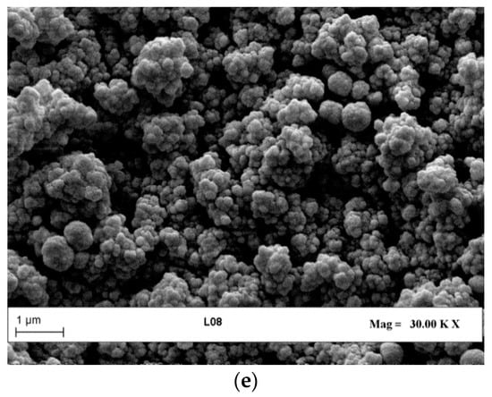 Scanning Electron Microscope observations of liposomes produced using SuperLip. (a) Lut1 (100 bar, 35 °C, and 1% DLR), (b) Lut3 (100 bar, 45 °C, and 1% DLR), (c) Lut 5 (150 bar, 45 °C, and 1% DLR), (d) Lut7 (100 bar, 45 °C, 0.5%), (e) Lut8 (150 bar, 35 °C, 0.5% DLR).