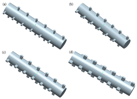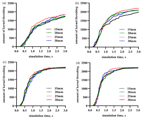 Figure 7c,d, the kernels started to be threshed from 0.25 s when the drum rotation rate is 252.10 rpm and 317.15 rpm, respectively. Within the simulation time from 0.25 to 1.8 s, although the variation curves of the amount of threshed kernels under each width of the threshing component with the simulation time were different, the kernels had been threshed off by 1.8 s, and the threshing efficiency was higher. In the simulation time of 1.8 to 3.0 s, the variation curves of the amount of threshed kernels with simulation time for each width of threshing component differed slightly, which showed that the influence of drum rotation rate on threshing efficiency is greater at a high rate, which is consistent with the variation of threshing rate under the corresponding width of threshing component in