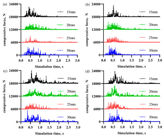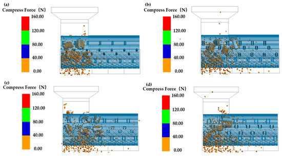 In order to study the effect of the width of the threshing component on the rate of kernel damage from a microscopic perspective, the kernel total compressive force was analyzed during the simulation time.