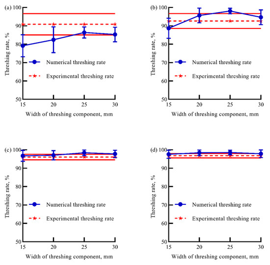 Figure 5b, the drum rotation rate is 187.50 rpm, and when the width of the threshing component increased from 15 mm to 25 mm, the threshing rate increased from 88.66% to 98.04%, and when the width of the threshing component increased from 25 mm to 30 mm, the threshing rate decreased from 98.04% to 94.66%.