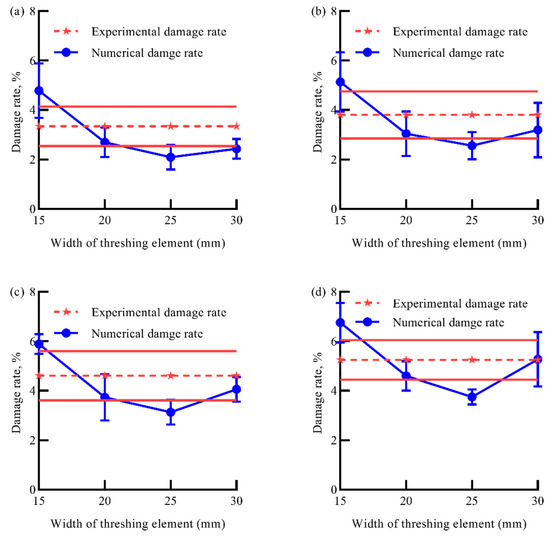 Figure 6b–d, when the drum rotation rate is 187.50 rpm, the width of threshing component increased from 15 mm to 30 mm, and the simulated damage rate decreased from 5.13% to 2.56%, and then increased from 2.56% to 3.19%.