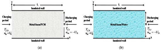 A simple schematic view of the forced convection problem under study is depicted in Figure 1. Based on the semi-infinite approximation along the Z-axis, the computational domains are a two-dimensional straight channel whose horizontal walls are adiathermic, impermeable, and non-slip. They are of length and height L and H and are filled with a porous metal foam including paraffin as the PCM impregnated in its pore space (latent heat; case 1) or the same metal foam saturated with liquid water (sensible heat; case 2). Note that the charging process starts with a hot temperature and a uniform velocity (west), while the discharging process begins at cold temperature () and velocity (east). It is very useful to point out that in the first case (Figure 1a), the thermal input condition is well set so that the PCM can start to melt (), while in the second case (Figure 1b), water keeps its liquid state.
