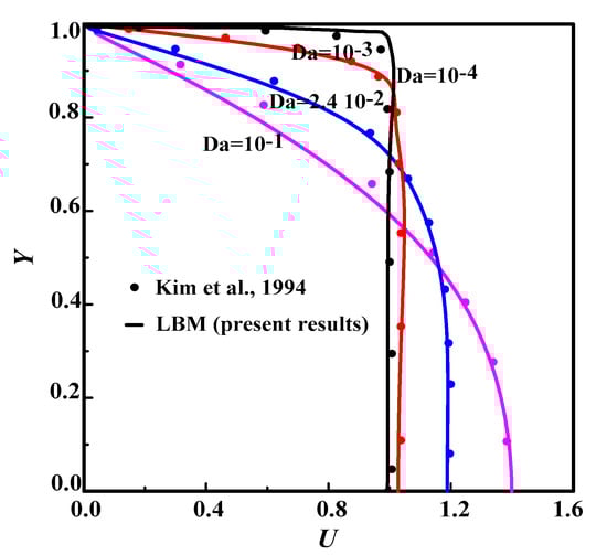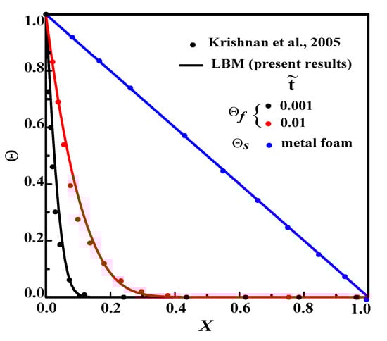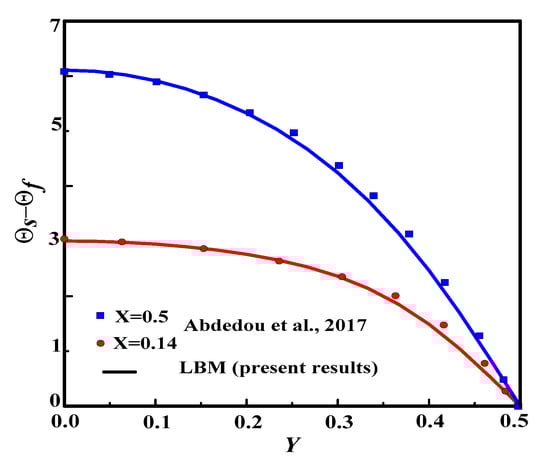 The implemented code having been previously validated with and without phase change, only the following three relevant cases were selected. The U-profiles at X = 0.5, for Re = 50 and Pr = 0.7 set for different Darcy numbers, can be observed in Figure 2 for a quantitative comparison between our TLBM results and those of Kim et al. [48]. The good qualitative and quantitative agreement is also apparent by presenting the LTNE intensity in Figure 3 along the dimensionless transverse distance Y at two axial positions X = 0.5 and X = 0.14, thereby strengthening the comparison with Abdedou et al. [49]. Finally, as shown in Figure 4, the evolution of dimensionless fluid () and solid () temperatures is consistent with the results of Krishnan et al. [50], thereby confirming both the implemented model validity and our code reliability.