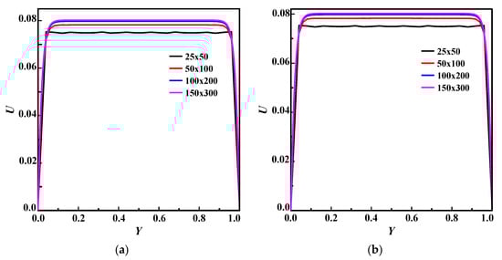 As the grid independence test is of the utmost matter to assess the numerical results accuracy, a grid independence study has been conducted using four different grids, viz., and for the two deemed cases herein (see Figure 1) for PPI = 30; , and Re = 400 to decide on the most suitable grid number. The test is performed by computing the dimensionless U-velocity vs. the widthwise distance, as depicted in Figure 5. It turned out that the maximum error between the 25 × 50 and 50 × 100 grids is about 7.7%. Then, the grid was refined, and the error was dropped to 1.2% between 50 × 100 and 100 × 200. Such a process was pursued to note only a minimum deviation of 0.43% between the 100 × 100 and 100 × 200 grids. Thereby, we opted for the third grid for the subsequent simulations.