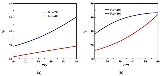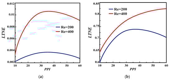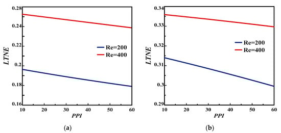 The effects of the pores’ density () on the LTNE intensity are exhibited in Figure 6 and Figure 7 for Re = 200 and 400 during both charging and discharging processes. The results show that this parameter has a significant effect, especially at Re 400. As can be seen (Figure 6), the LTE assumption could be adopted during the charging process for case 1, since [49,51], 0.05 being the limit value allowed so that the LTNE can be conjectured. This obviously cannot be for case 2 () whatever PPI and Re. However, during the discharging process (Figure 7), the LTNE intensity is secured for both cases while decreasing with increasing PPI, regardless of Re.
