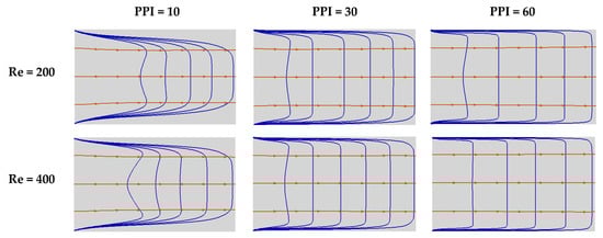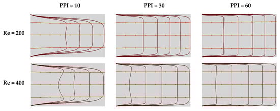Figure 8 and Figure 9 exemplify the PPI’s effect on U-velocity and streamlines for the two cases 1 and 2. During the charging process, it is clear from these figures that the velocity distribution displays an approximately similar shape in both cases. In addition, it appeared that the PPI increase flattens the velocity distribution, indicating that the permeability (or Darcy number) inside the channel is decreasing.