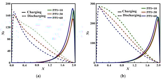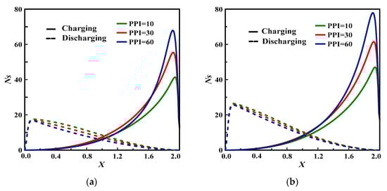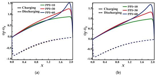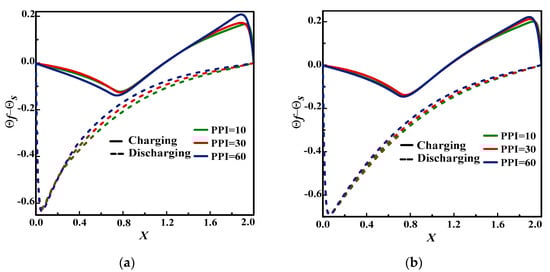 Figure 10 and Figure 11 depict the PPI’s effect on dimensionless intensity () during two processes for both cases. As can be seen, the temperature profiles exhibit completely different shapes for latent and sensible heat cases. It is observed that during the charging process, the temperature intensity decreases to X = 2/5 of the channel and then increases until it reaches its maximum near the channel exit before decreasing further due to the channel cold exit. This is because the temperature of the metal is higher than that of the paraffin in 2/5 of the channel due to the high thermal conductivity of the metallic foam, thereby revealing the dominance of the forced convection. From there, the paraffin temperature rises faster than that of the foam (melting phase) to drop at the channel exit due to the forced convection weakness to the detriment somewhat of the particles’ thermal conduction, which is accentuated. In both cases, it appears that this effect remains slight regardless of the process nature (loading or unloading). As for the second case under the charging process, the temperature constantly rises with the PPI and decreases at the channel end where the two temperatures equalize, implying that the LTE assumption can be cited between the foam and water. In addition, for this model (Figure 11), the fluid temperature generally remains higher than that of the solid, indicating that it is the thermal conduction mode that predominates. Simply stated, an increase in the PPI value inhibits (hampers) forced convection. During the discharge process, the PPI has practically no effect in the second case, the profiles being very close to each other.