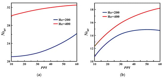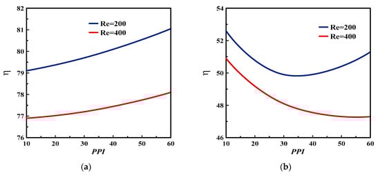 Test grid numbers at X = 0.5, for PPI = 30, , and Re = 400: (a) Case 1; (b) Case 2.