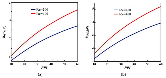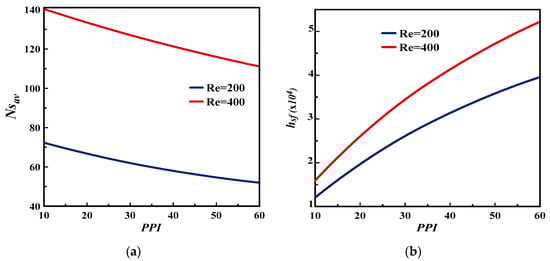 In this section, the numerical results from the model of considered equations are presented and discussed, and the effect of the following parameters is studied on the fluid flow, heat transfer, LTNE intensity, entropy generation rate (Ns), and interfacial heat transfer: pore density () and Reynolds number (200 and 400). Furthermore, it is worth stating that the in-house code has been implemented and amply benchmarked (see [15], to cite a few) at the LESTE/National School of Engineers of Monastir in Tunisia and at LGCgE/Univ. Artois in France.