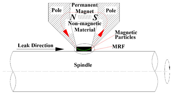 This study does not consider the change in the viscosity of the MR fluid. The MR fluid sealing device for the main shaft of a hydraulic turbine is shown in Figure 1. It is mainly composed of magnetic poles, a main shaft, permanent magnets, insulating materials, and MR fluid. The magnetic energy of the permanent magnet emerges from the N level, and passes through the magnetic pole, MR fluid, and main shaft, and finally, through the other side of the magnetic pole to return to the permanent magnet S level. The MR fluid located between the main shaft and magnetic poles (sealing gap) is subjected to magnetic force, and the magnetic particles in the MR fluid gather into chains to prevent leakage of the sealed medium and achieve the purpose of sealing.