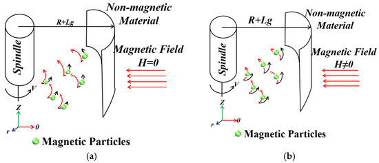 Figure 2 shows a schematic of the shear flow of the MR fluid. Figure 2a shows the shear flow of the MR fluid under the condition of an external magnetic force H = 0. Figure 2b shows the MR fluid under the condition of an external magnetic force H ≠ 0. When the external magnetic force H = 0, the MR fluid moves circularly around the z-axis under the action of the centrifugal force of the main shaft of the hydraulic turbine. When the external magnetic force H ≠ 0, the MR fluid moves under the action of the centrifugal force of the main shaft of the hydraulic turbine and the external magnetic force. An unbalanced curl, , is produced, which increases the friction between the MR fluid and main shaft of the hydraulic turbine, forming higher frictional heat, thereby reducing the saturation magnetic induction intensity of the MR fluid as well as the sealing pressure, eventually leading to reduced sealing.